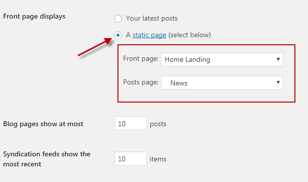 Select Front page as “A static page” and select Front page as “Home Landing” & Post page as “News”