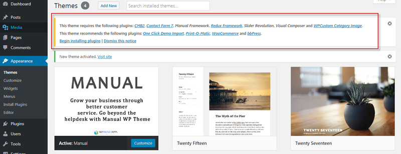 Once you have installed and activated manual you will be prompted to install recommended plugins. Just click the link to begin installing plugins.