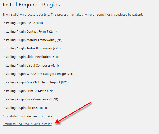 Installation can take a couple minutes depending on your host. You should see a success confirmation for each plugin as it is installed. After you have installed all the plugins, return to the plugin installer.