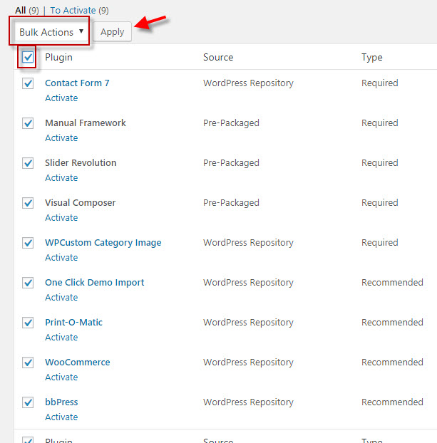 Select the plugins you installed, and apply the bulk action to activate.