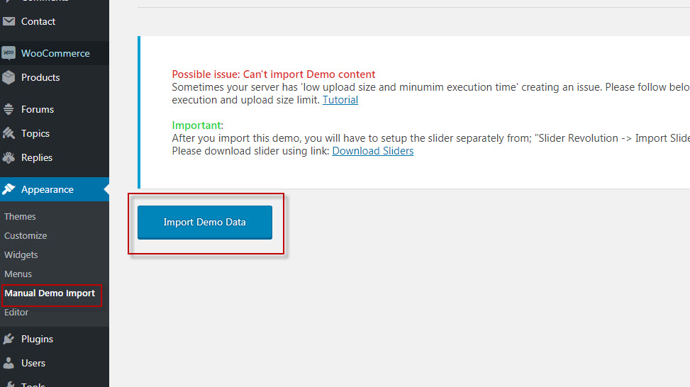 Go to Appearance -> Manual Demo Import and click on Import Demo Data.