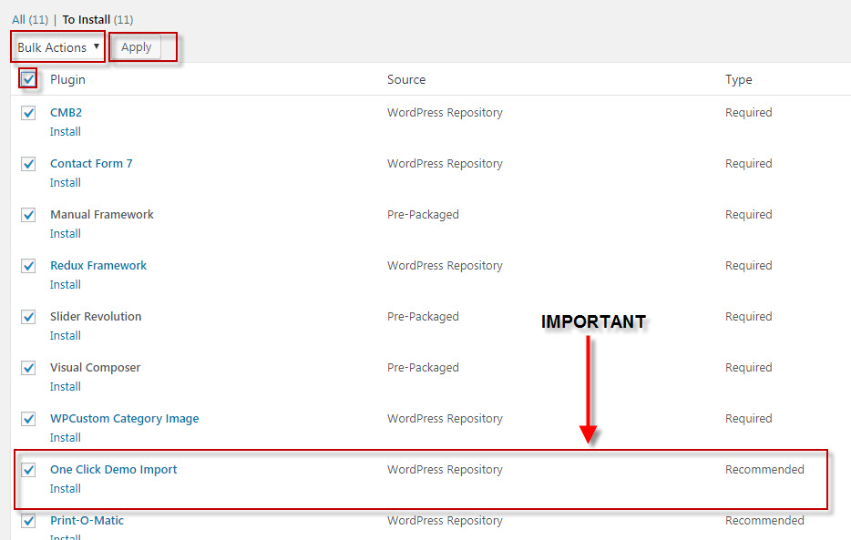 Next, check boxes to select all the plugins you want to install, select the bulk action of install from the drop-down box and then click the button to apply.